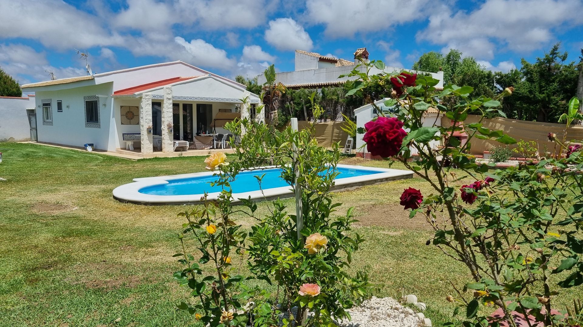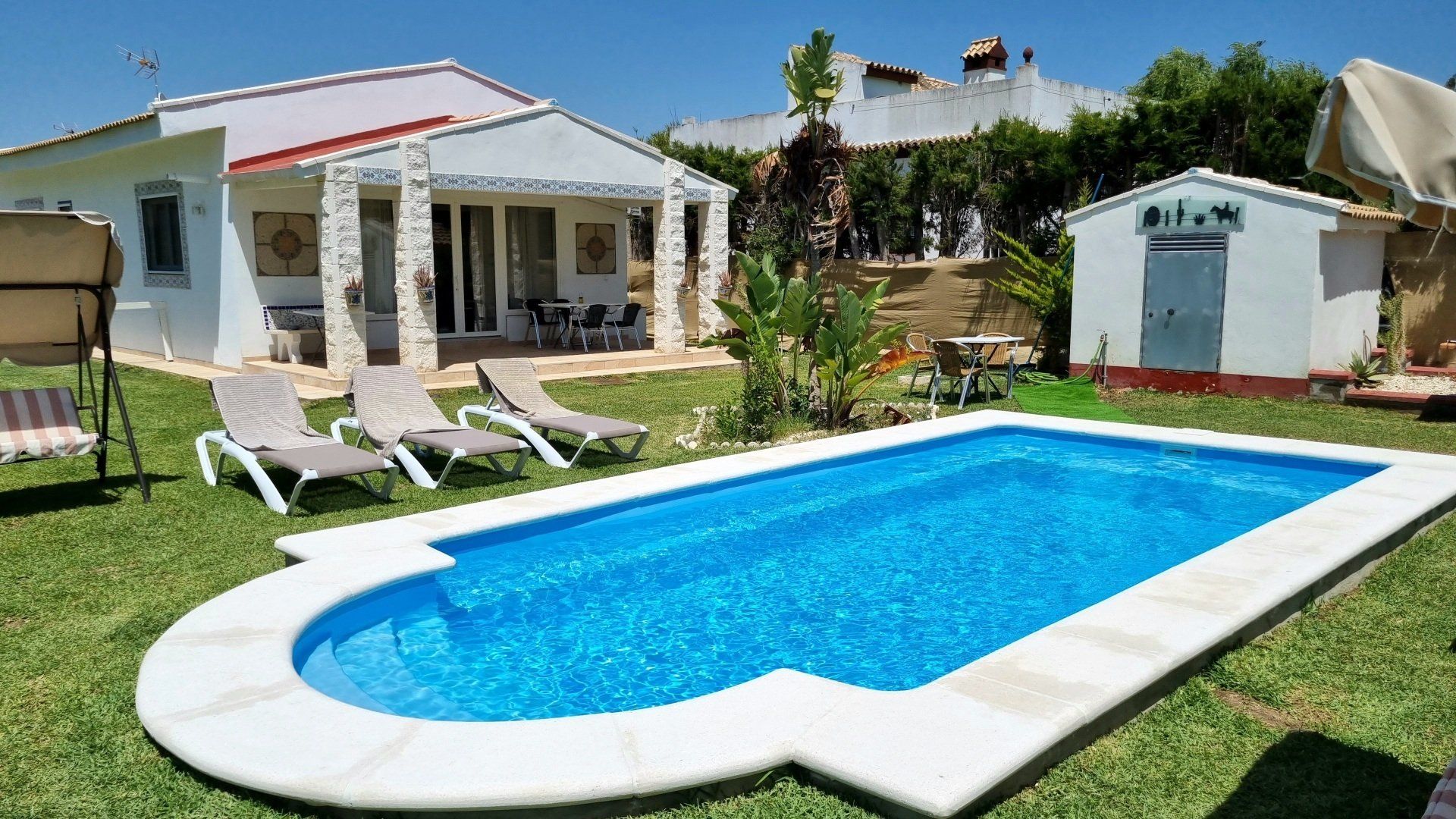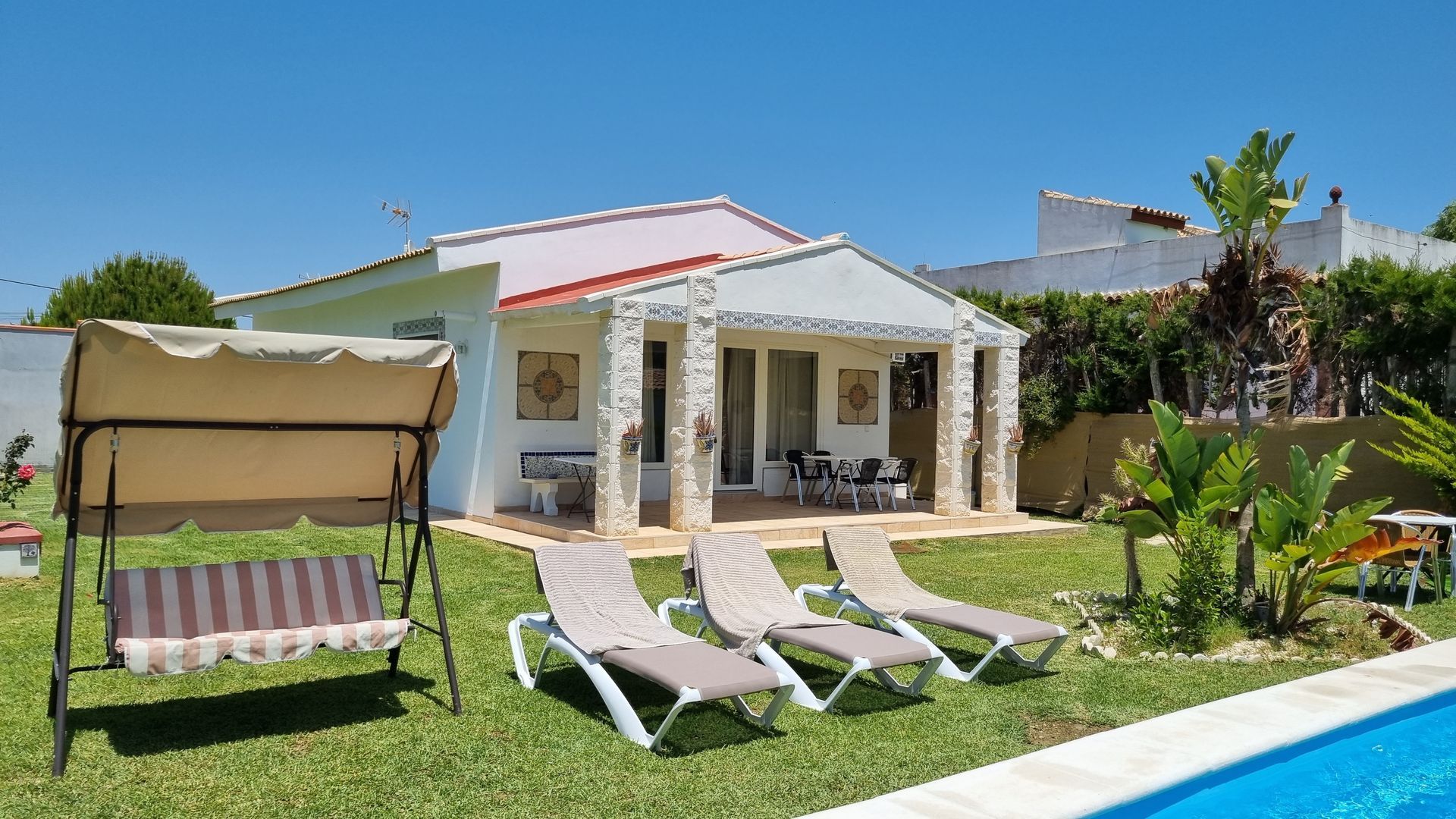 Casa Levante ist ein komfortables Haus mit 1500m² gut ausgestattetem Gemeinschaftsgarten für zwei Häuser in der Nähe des schönen Strandes 'La barrosa'. Kinder und Haustiere sind willkommen. Sie und Ihre Familie finden genug Platz, um sich auf der Terrasse zu entspannen, zu spielen, im Schatten unter den Bäumen zu liegen oder zu grillen. Die Nachbarschaft in der ruhigen Straße ist freundlich und entspannt.